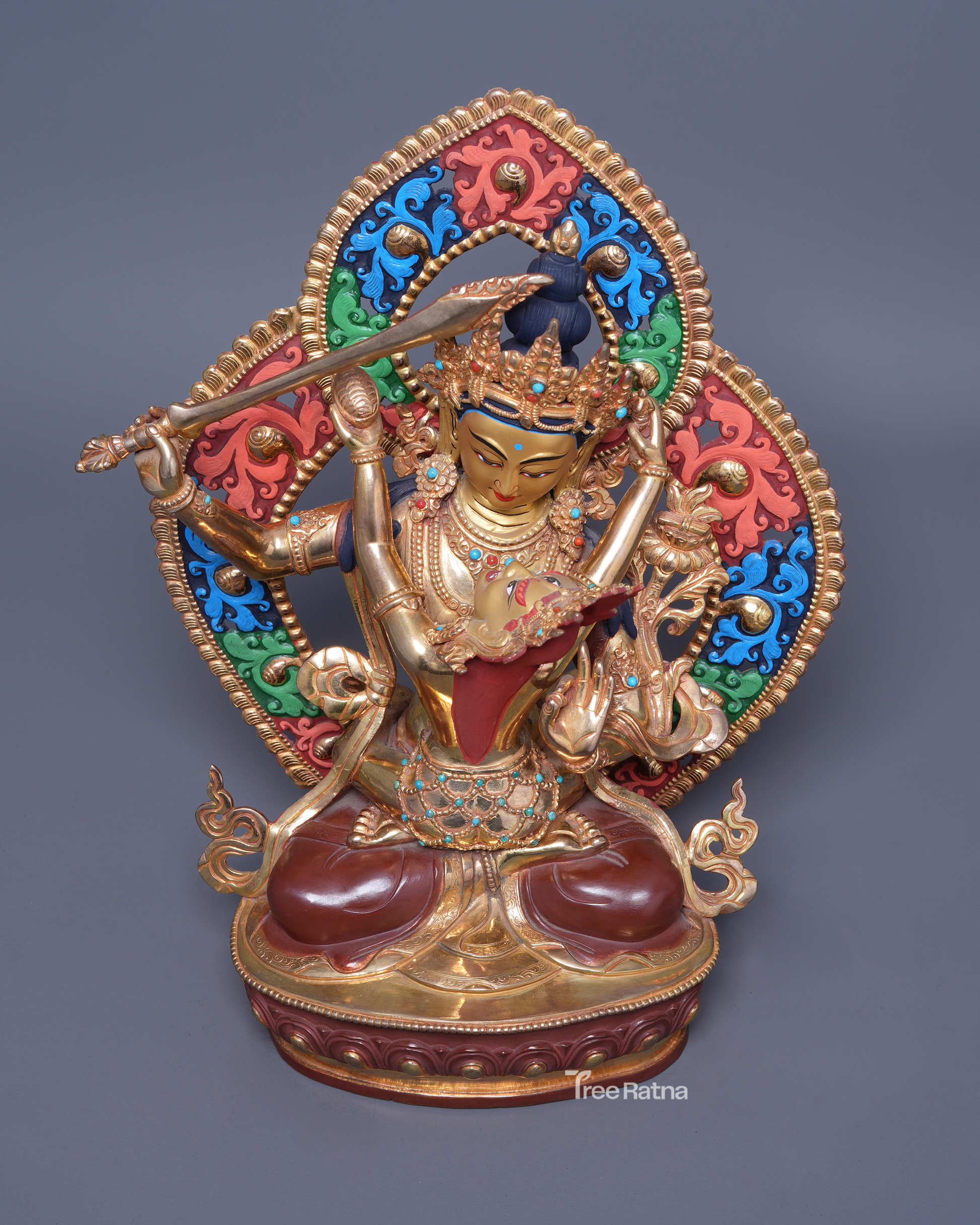 Radiating the divine harmony of transcendent wisdom and boundless compassion, this Manjushri with Consort statue is a profound embodiment of enlightenment’s dual nature. Crafted from a solid copper body, it is exquisitely gilded with 24K gold, adorned with sparkling gemstones, and brought to life with 24-carat gold dust detailing on the face.