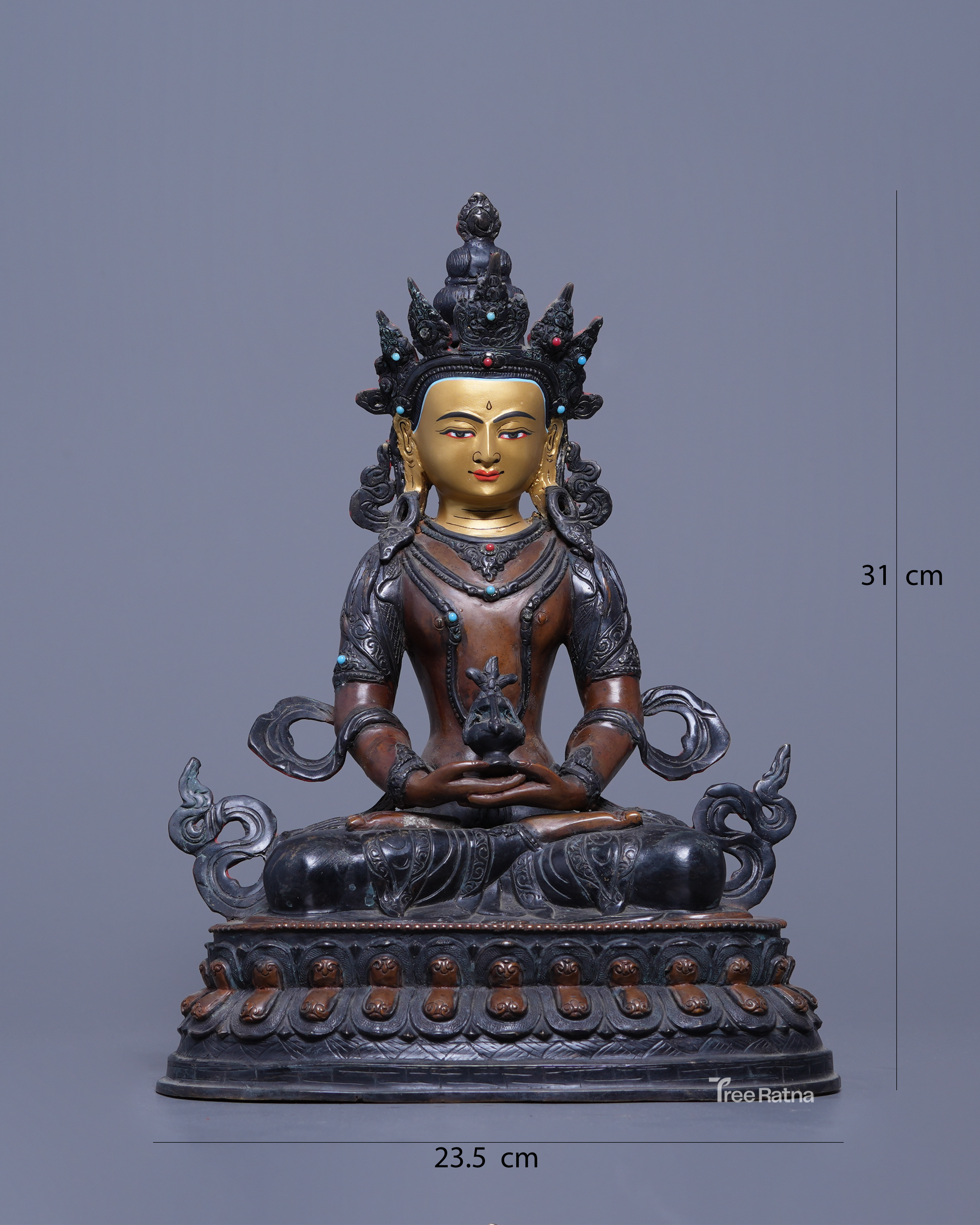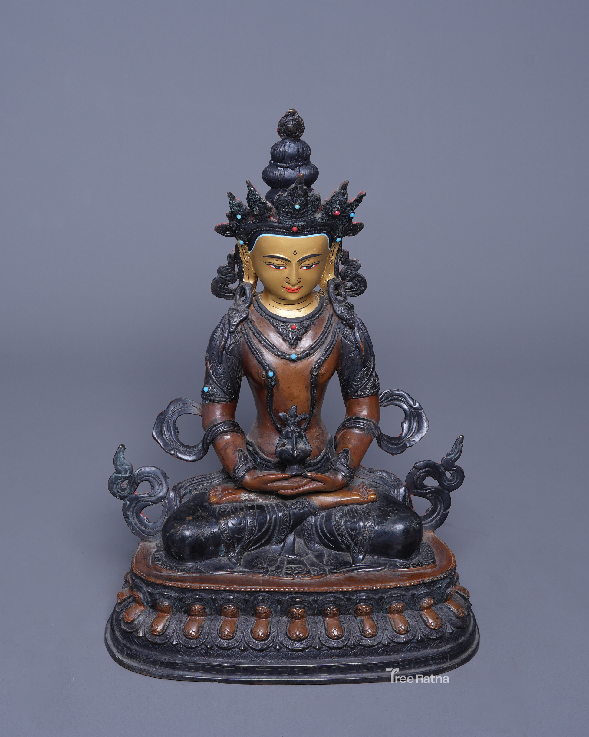 Amitayus Statue – Oxidized Copper & 24K Gold Face | Handmade Nepal
