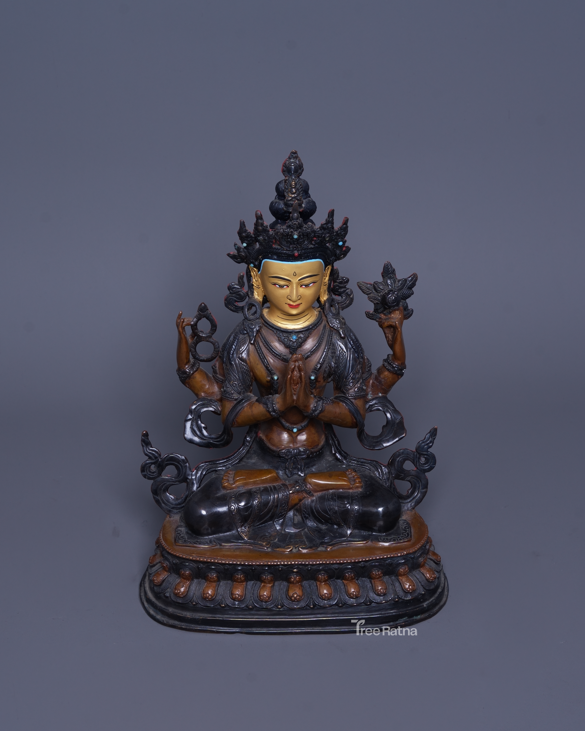 Chenresig Statue – Oxidized Copper, Gemstone Inlay & 24K Gold Painted Face | Handmade Nepal