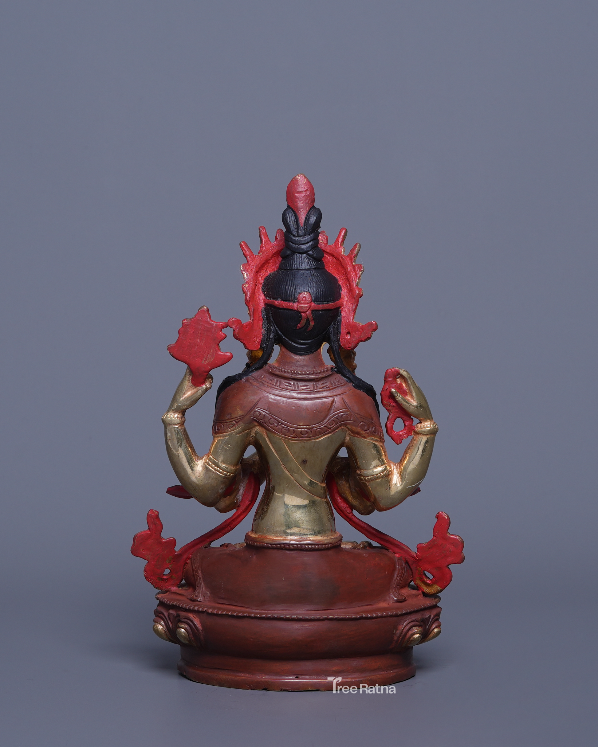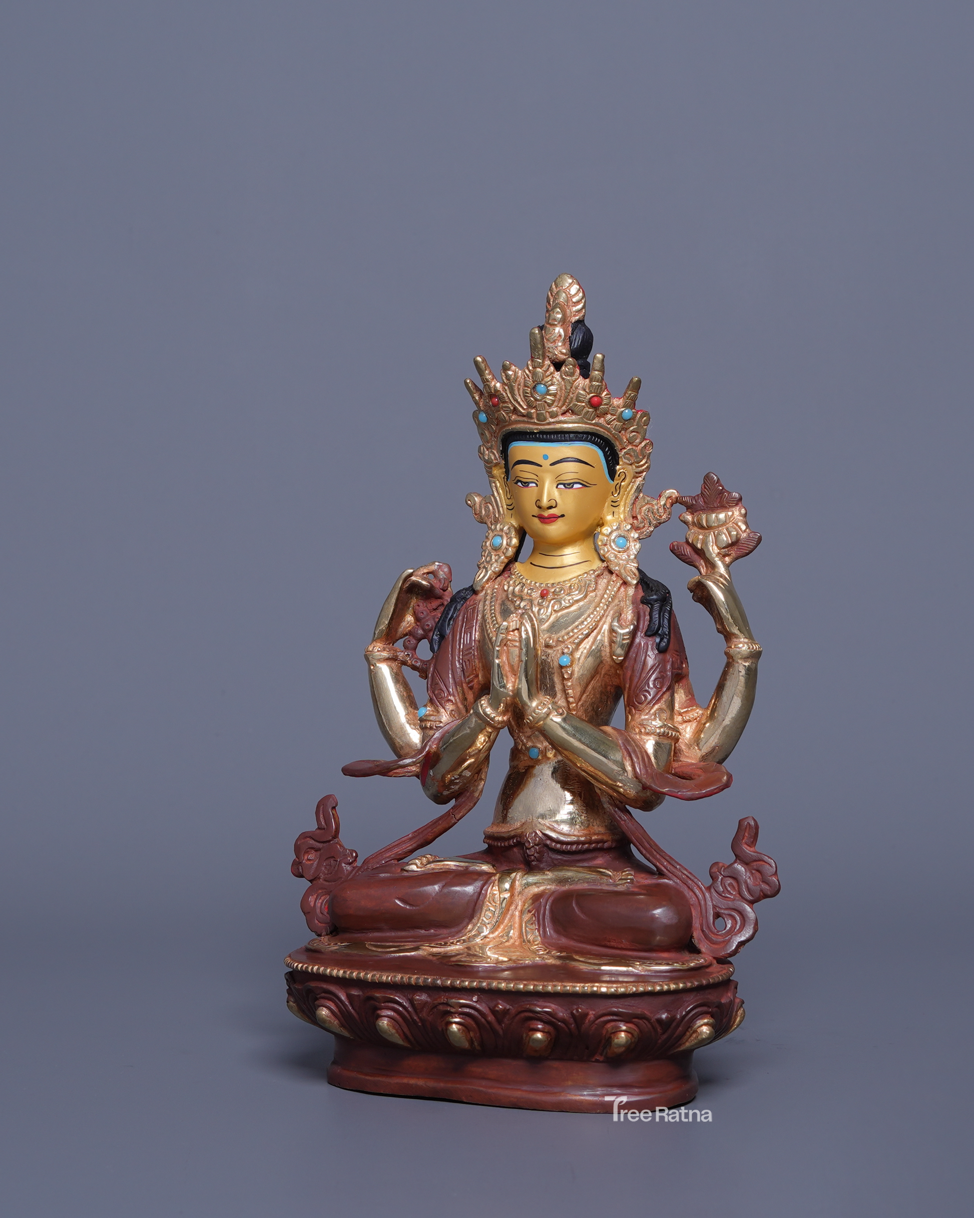 Four Armed Chenresig Statue – Embodiment of Infinite Compassion | 24K Gold Gilded Copper