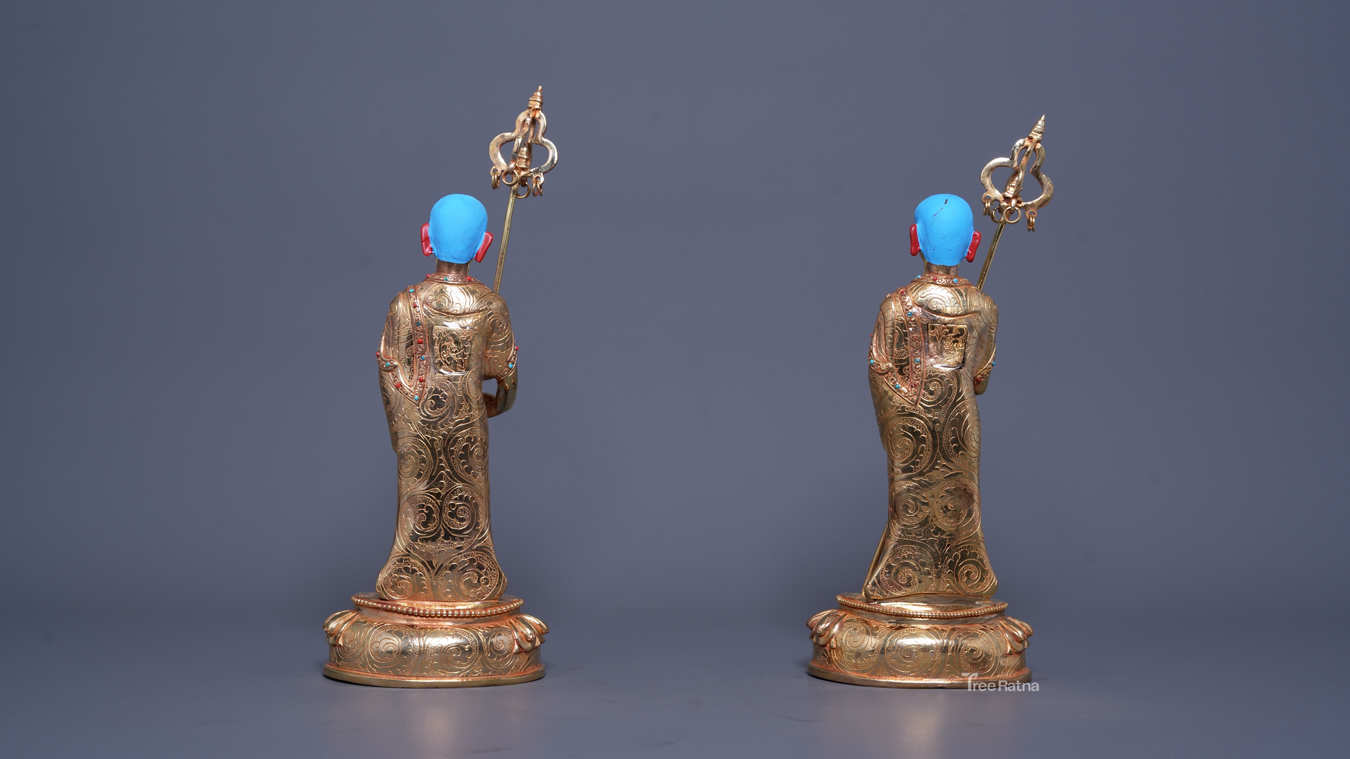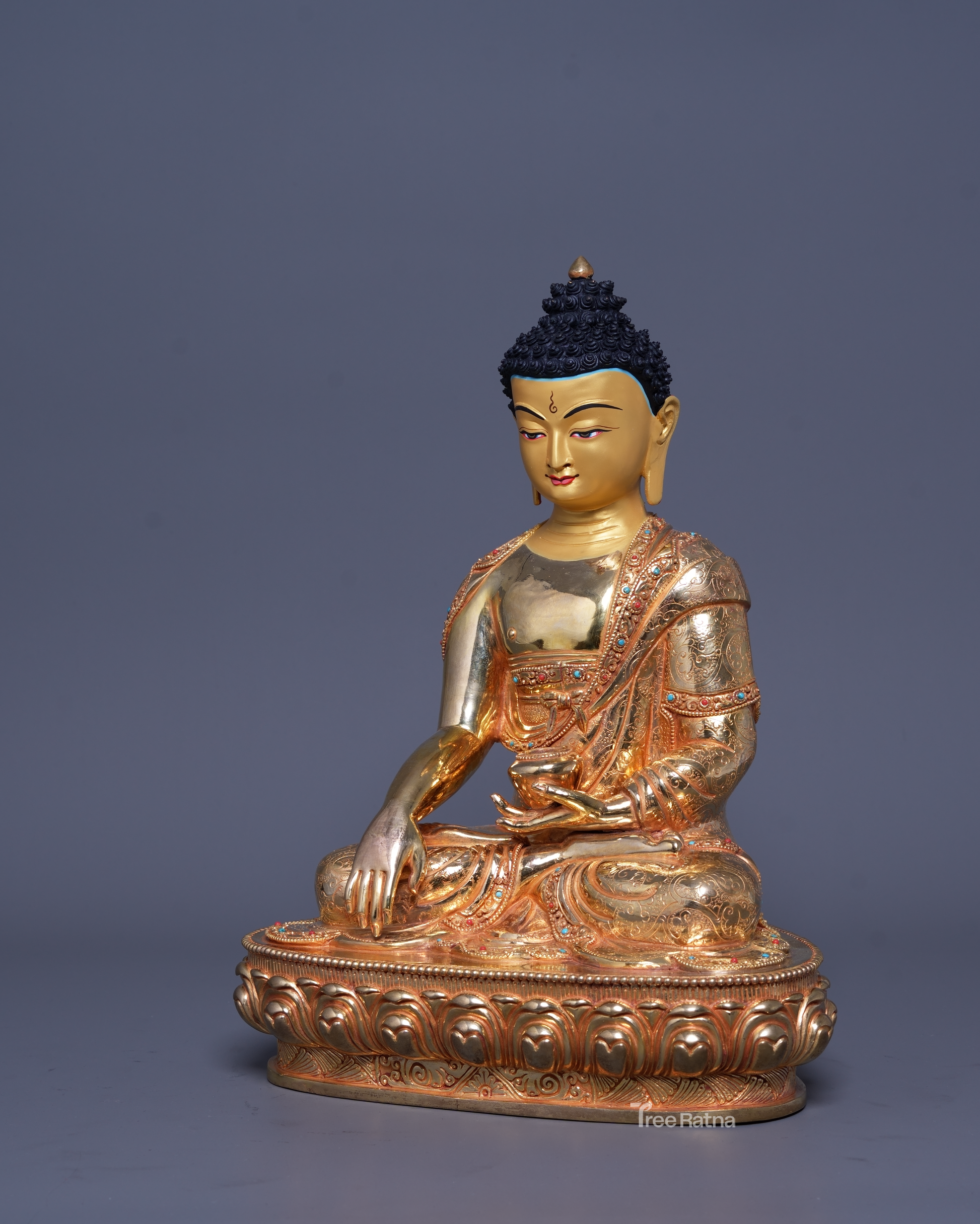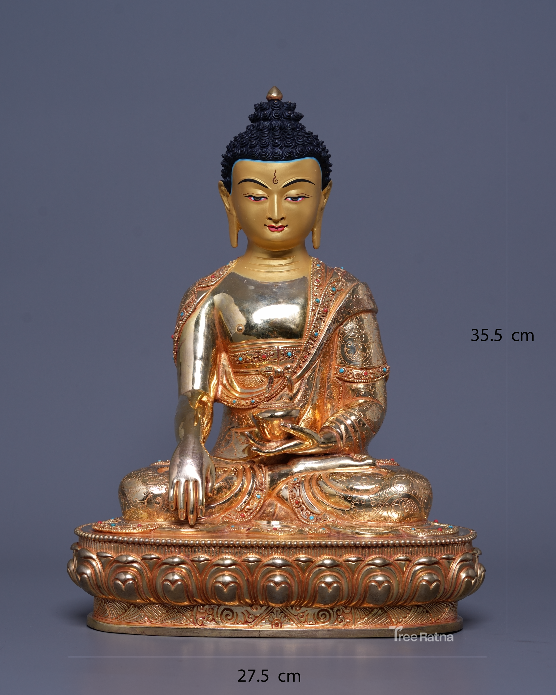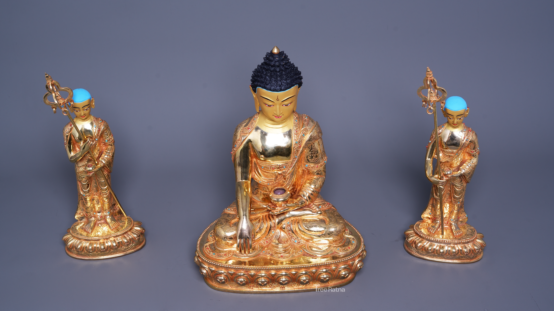 Invite timeless serenity into your sacred space with this Shakyamuni Buddha with Disciples Statue, a handcrafted Himalayan masterpiece symbolizing enlightenment and devotion. Created with a copper body, graced with 24K pure gold gilding, and adorned with small gemstones, this sacred statue radiates divine brilliance. The compassionate face of the Buddha, delicately painted with 24-carat gold dust, reflects profound tranquility and boundless wisdom.