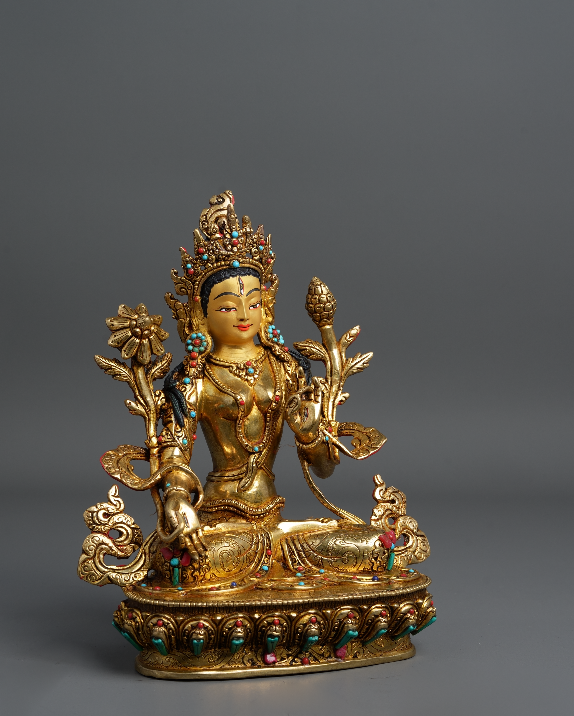 Elevate your sacred space with the White Tara Statue, a divine embodiment of compassion, longevity, and serenity. Handcrafted with meticulous attention, this exquisite statue features a copper body adorned with 24k gold gilding, while delicate gemstones enhance its aura of grace. The serene face is beautifully painted with pure 24k gold dust, reflecting a subtle divine radiance that captivates the heart and mind.